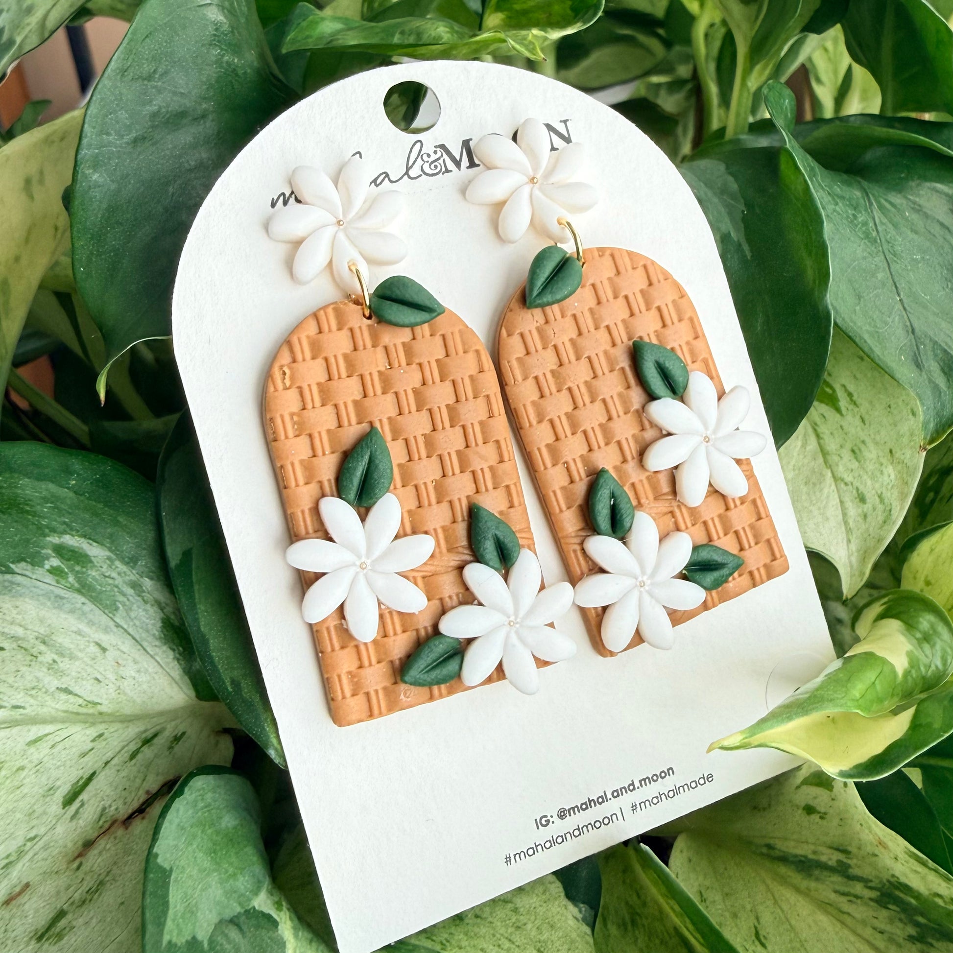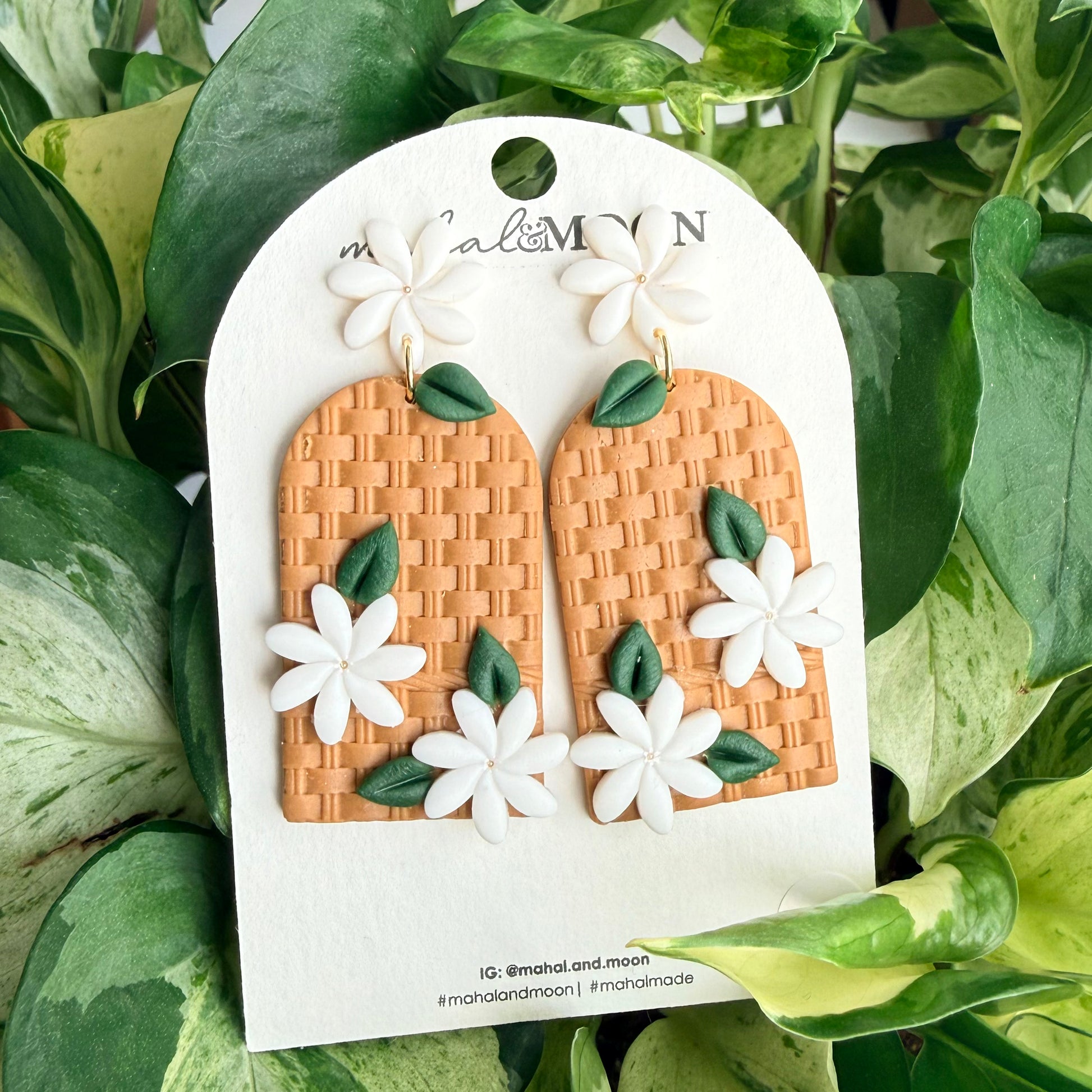 This pair features white tiare (Tahitian gardenia) flowers on a basketweave-textured arch. The stud is a tiare flower.
